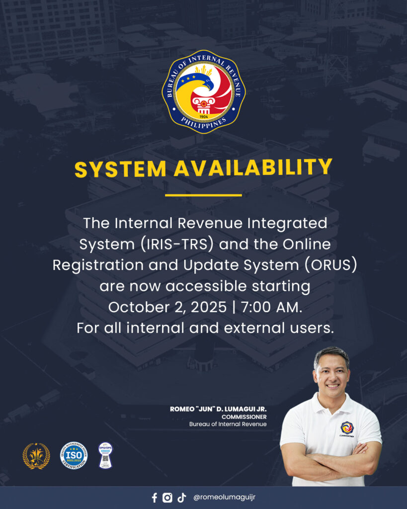 From BIR Commisioner’s social media post – “Magandang balita! Maaari nang ma-access ang Internal Revenue Integrated System (IRIS-TRS) at Online Registration and Update System (ORUS) simula October 2, 2025, 7:00 AM.”