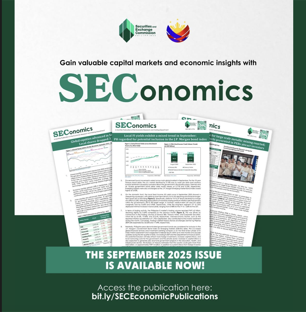 The SEConomics September 2025 issue features key developments in the global equities and fixed income markets, the country’s national debt, and the enactment of Republic Act No. 12253, or the Enhanced Fiscal Regime for Large-Scale Metallic Mining Act.
